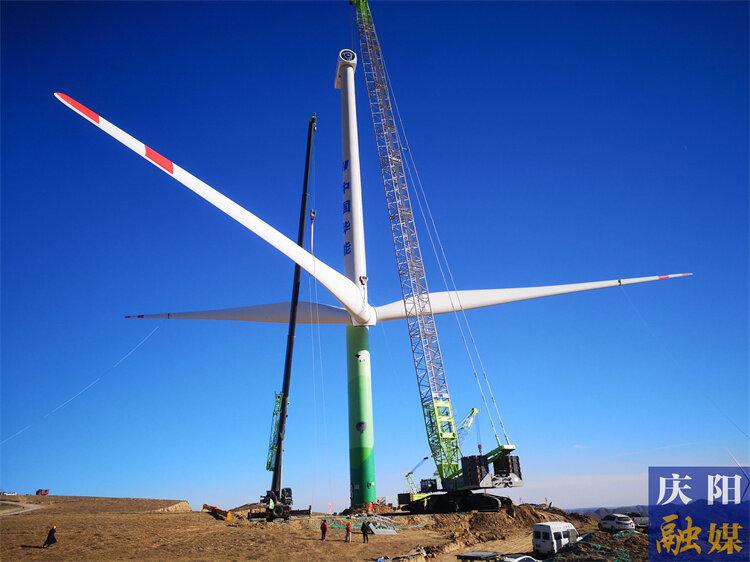 華能慶陽(yáng)600萬(wàn)千瓦新能源示范項(xiàng)目風(fēng)機(jī)吊裝現(xiàn)場(chǎng)。(項(xiàng)目方供圖)