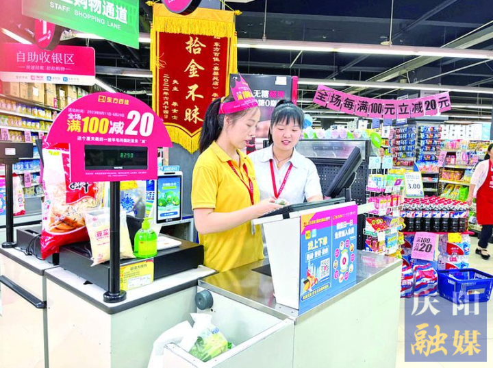 鄢均芳對門店收銀員進行業(yè)務(wù)指導(dǎo)。