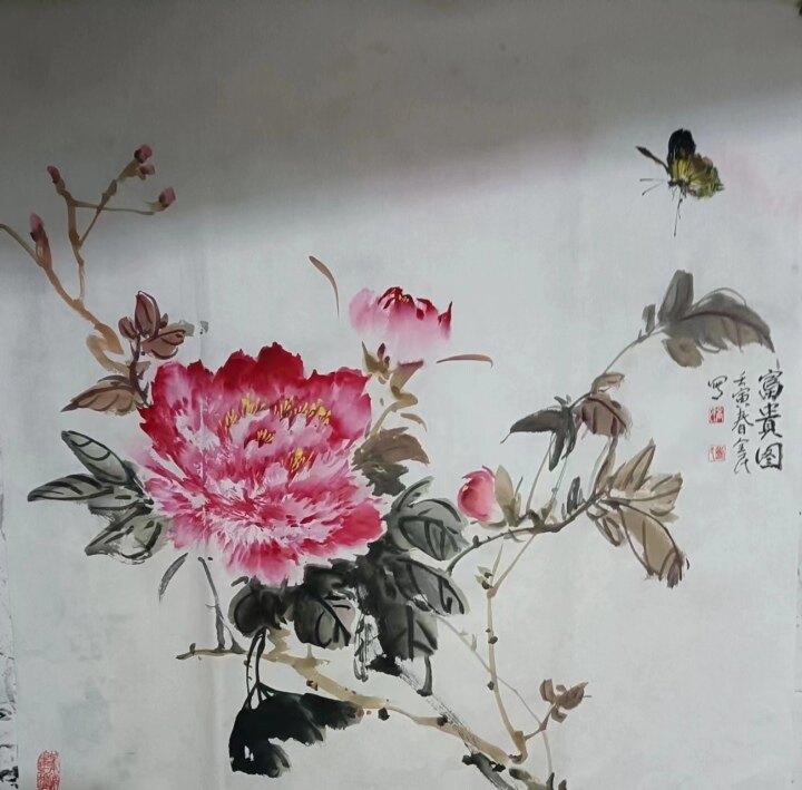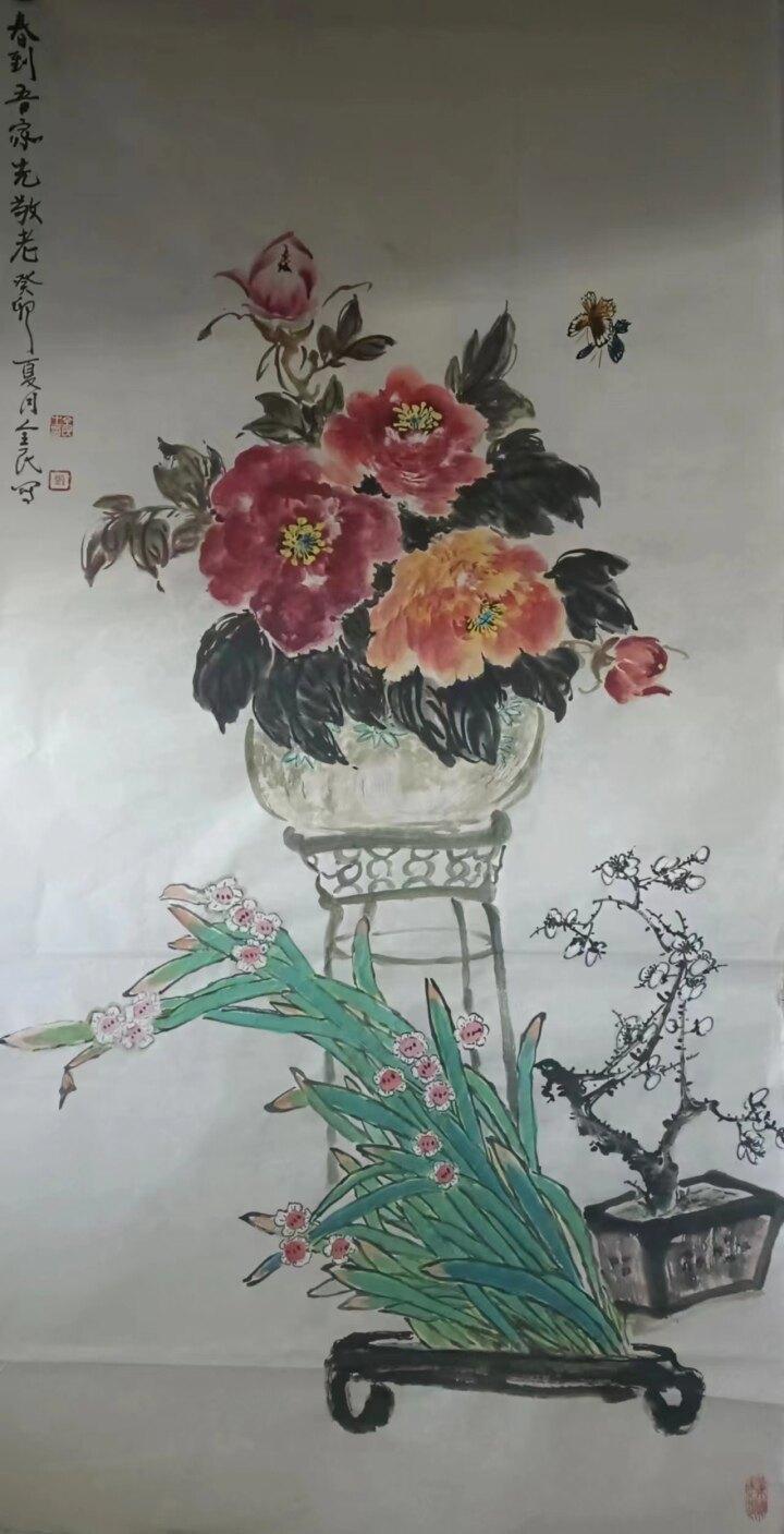 劉全民國畫主攻花鳥,尤其擅畫牡丹。他的牡丹多取法于自然,精煉于寫生。在每年牡丹競放的日子,總是能在周邊的牡丹園見到劉老師寫生的身影,未開的牡丹、即將綻放的牡丹、完全開放的牡丹,凋謝的牡丹、風(fēng)中的牡丹、雨中的牡丹等等都是他寫生必須去研究揣摩的元素,多年來,他憑借著對藝術(shù)的一腔熱忱,不斷探索創(chuàng)新,使牡丹的姿態(tài)與靈魂完美契合,使繪畫的風(fēng)格與鮮明的個性完美契合,他近年來國畫創(chuàng)作的牡丹,枝干柔中帶剛,運(yùn)墨層次分明,運(yùn)色考究、渾厚深沉,給人以視覺上和心靈上優(yōu)雅美的享受。