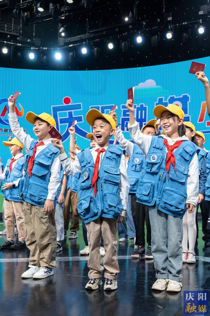 慶陽市融媒體中心黨組書記、主任先朝陽為小記者發(fā)放“記者證”。