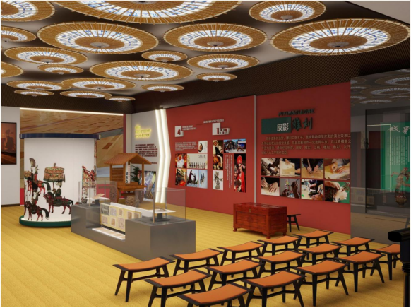 展廳入口采用杜邦紙透光影效簡(jiǎn)介環(huán)縣皮影,門楣設(shè)八米環(huán)縣長(zhǎng)卷,壯麗鄉(xiāng)情一覽無余,立體發(fā)光大字“環(huán)縣·中國(guó)皮影之鄉(xiāng)”。展廳正中心設(shè)計(jì)動(dòng)力旋轉(zhuǎn)裝置展示《帝王出巡》皮影作品。展廳正面設(shè)計(jì)有皮影演藝臺(tái),四十多家道情皮影班組等待為參展人員一展絕藝。展廳兩個(gè)側(cè)面設(shè)計(jì)立體造型墻,宣傳非遺之美、環(huán)縣皮影之美。展廳天花為傘形燈光覆蓋,傘面有絕美環(huán)縣詩章散發(fā)濃厚人文氣息。皮影制作展區(qū)設(shè)置于展廳左中。