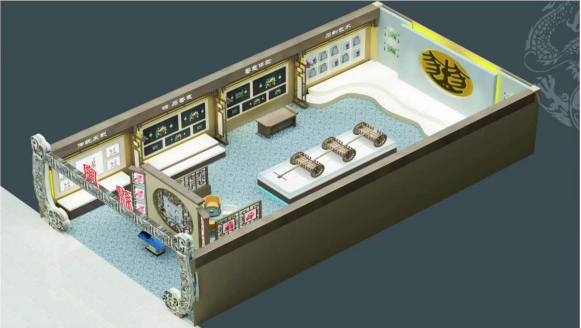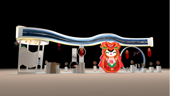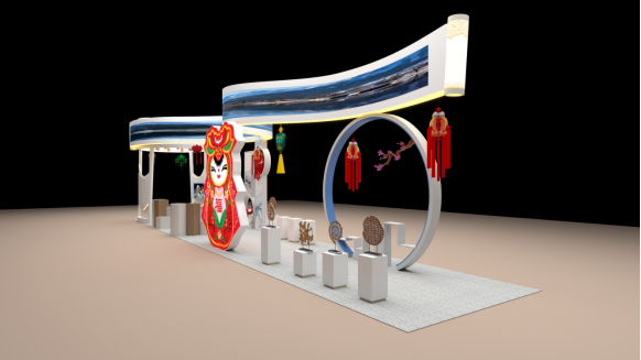 展廳入口設(shè)計(jì)鏤空立體雕刻兩個(gè)吉“象”門迎,門頭上面設(shè)計(jì)曲面波動(dòng)造型及交織飄帶造型,立體發(fā)光大字“合水”。展廳正中心設(shè)計(jì)傳統(tǒng)兩組大象立體造型,用于懸掛各類民俗產(chǎn)品等,中間位置設(shè)置多層展臺(tái)擺放面塑等作品。展廳正面設(shè)計(jì)立體規(guī)則的多層五角星輪廓、四周設(shè)計(jì)燈帶,作為中心展臺(tái)展位,便于擺放、懸掛民俗文化展品。突出展示合水面塑、香包、根雕、刺繡等。展廳兩個(gè)側(cè)面設(shè)計(jì)鏤空立體雕刻6組,用于懸掛刺繡剪紙等作品,虛實(shí)結(jié)合,下面設(shè)計(jì)展臺(tái),突出展示合水其他大小件擺件等。展廳頂子設(shè)計(jì)不同的拉布燈箱及角花,采用圖案以合水五張名片為主。