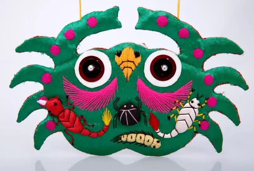從大量的慶陽香包原創(chuàng)作品中,我們可以看到龍不象龍,鳳不象鳳,幾種花草可以盛開在一起,一個人頭上前后左右都是鼻子、眼睛、嘴;一只母虎肚里懷著虎崽,不僅外形夸張,運用意象造型,而且在色彩、透視、解剖上都呈現(xiàn)出一種不合理性,而恰恰是這種稚拙的不合理,才構(gòu)成了香包作為民間藝術(shù)獨有的審美觀念。