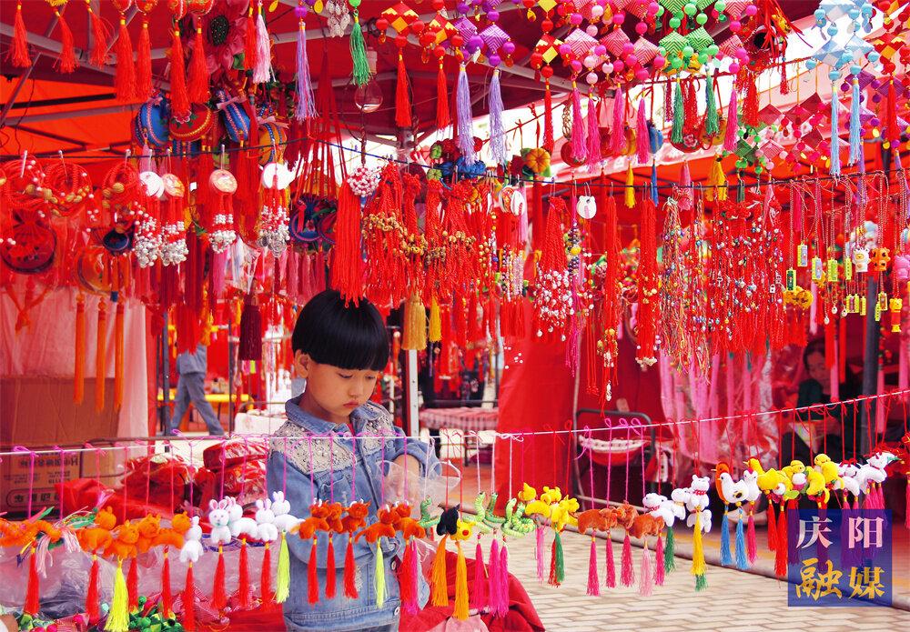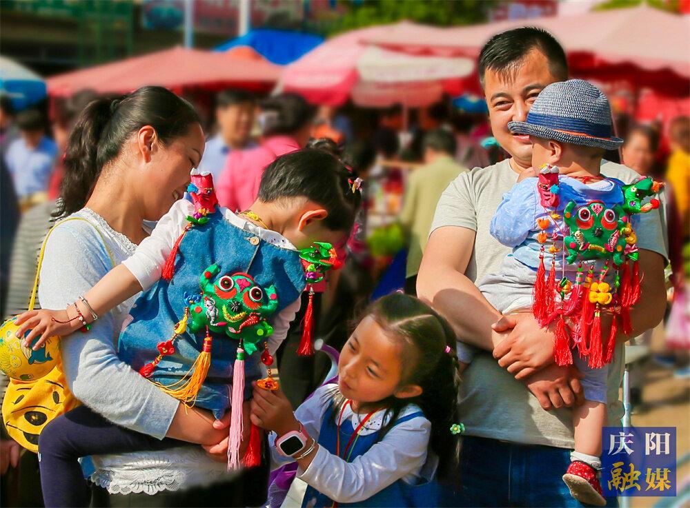 小朋友在街頭挑選喜歡的香包。慶陽融媒特約攝影 俄少飛 攝