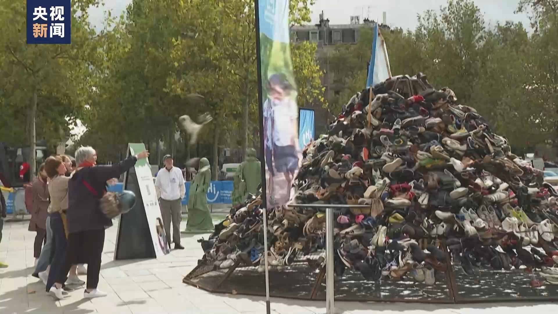 在美國(guó)宣布向?yàn)蹩颂m運(yùn)送集束彈藥的背景下,22日,“國(guó)際助殘組織”在法國(guó)巴黎舉行“鞋子金字塔”活動(dòng),邀請(qǐng)公眾脫下鞋子并堆成一個(gè)巨大的金字塔,這象征著因地雷和集束彈藥傷殘的受害者。