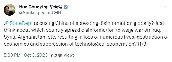 美國(guó)國(guó)務(wù)院上月28日炮制虛假報(bào)告,謊稱中國(guó)正斥資數(shù)十億美元在全球散布虛假信息。我外交部發(fā)言人華春瑩3日在X平臺(tái)對(duì)美方的謬論予以了駁斥。