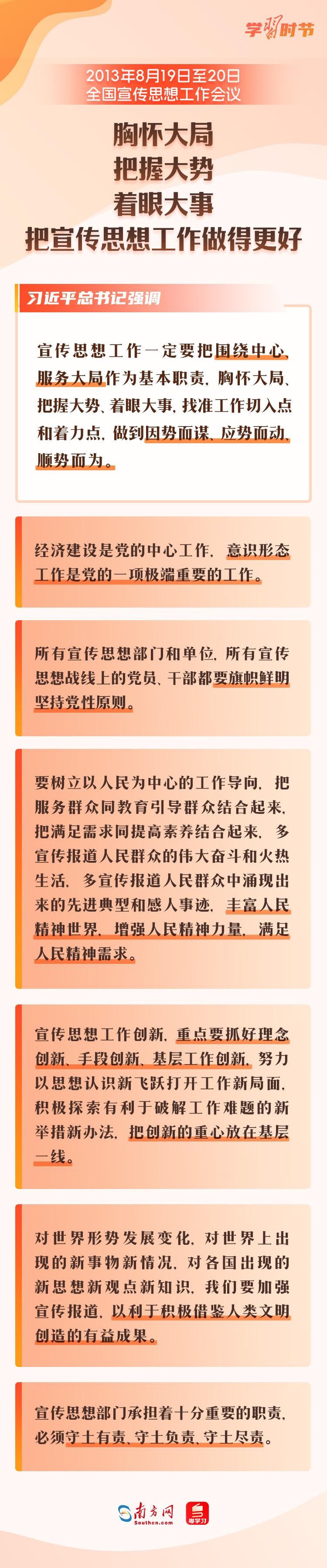 宣傳思想文化工作事關(guān)黨的前途命運(yùn),事關(guān)國家長治久安,事關(guān)民族凝聚力和向心力,是一項(xiàng)極端重要的工作。黨的十八大以來,宣傳思想文化工作之所以取得歷史性成就,最根本就在于有習(xí)近平總書記領(lǐng)航掌舵,有習(xí)近平新時(shí)代中國特色社會(huì)主義思想科學(xué)指引。讓我們一同回顧剛剛召開的全國宣傳思想文化工作會(huì)議,以及2018年、2013年召開的兩次全國宣傳思想工作會(huì)議,看看總書記通過這三次會(huì)議,為宣傳思想文化工作劃出了哪些重點(diǎn)。