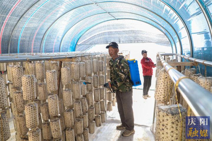 連家砭村居民在自家院內(nèi)的菌棚里忙碌。