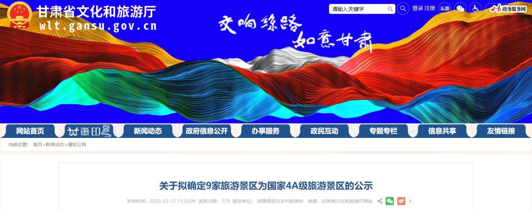 根據(jù)中華人民共和國《旅游景區(qū)質量等級的劃分與評定》和《旅游景區(qū)質量等級管理辦法》,經有關市州文化和旅游部門推薦,甘肅省文化和旅游廳按程序組織綜合評定,以下9家旅游景區(qū)達到國家4A級旅游景區(qū)標準要求,擬確定為國家4A級旅游景區(qū),現(xiàn)予公示。名單如下: