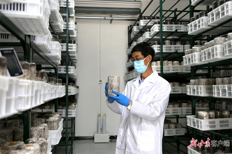 西峰區(qū)后官寨鎮(zhèn)食用菌基地科技人員檢查香菇菌種長勢。