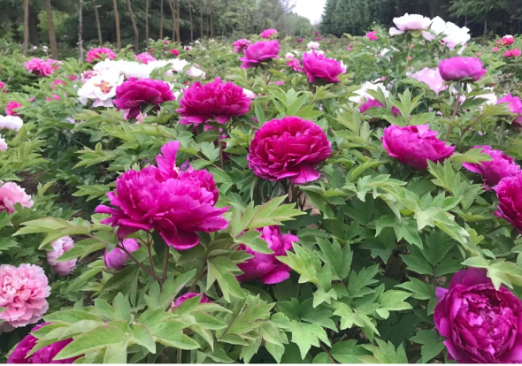 乘車出百花園,循寧文柏油公路,南行不足十分鐘即抵。走進(jìn)昔家牡丹園,花王、晨紅、百園紅霞、皇冠等百余品種的牡丹迎時(shí)綻放,滿眼花團(tuán)錦簇,恰似一幅富貴吉祥圖畫。這里的牡丹已炫美西北40余年,昔家人幾十年如一日的努力拼搏,編織成了如今美輪美奐的旖旎景觀。