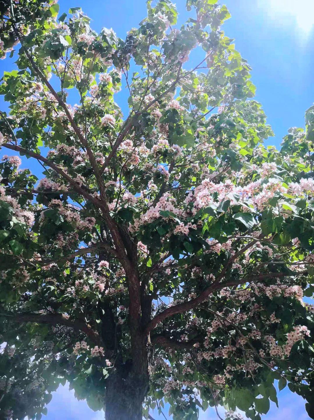 四月是鮮花盛開的日子,大地是花的舞臺(tái),各類鮮花紛紛亮相,展現(xiàn)出她們獨(dú)特的色彩,不一樣的形狀,別致的香味,演繹著她們或者短暫或長(zhǎng)久的綻放歲月。好多花都是一晃而過,最早的迎春花、杏花、桃花、油菜花、櫻花等等,她們依次綻放,短短幾天,她們又隨著時(shí)間飄落成泥。春花易逝,盛開的日子總是很短,一陣風(fēng),一陣雨,一樹鮮花就隕落了,好多花會(huì)孕育出幼小的果實(shí),有些花兒來去匆匆,幾天的時(shí)間,就會(huì)香消玉損?,F(xiàn)在,到了四月末,五月即將來臨,花季已經(jīng)接近夏季,在春季最后的舞臺(tái)上,楸樹開花了。