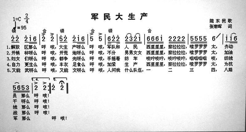 張寒暉結(jié)合《推炒面》《夯歌》,給這個(gè)曲調(diào)填入新詞,很快創(chuàng)作出了反映邊區(qū)軍民大生產(chǎn)的《軍民合作歌》,并將演唱形式由《推炒面》的獨(dú)唱改為一領(lǐng)眾和。