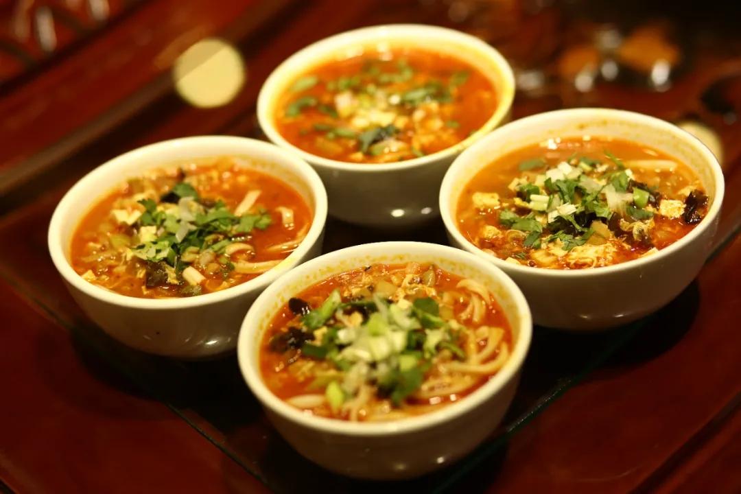 湯分為葷湯和清湯兩種,葷湯加臊子,清湯不加。清湯的做法:將白蘿卜、紅蘿卜、豆腐、土豆、番瓜、黃花菜、少許木耳切丁,其中白蘿卜丁、紅蘿卜丁用開水提前掠熟。炒制過程中加入大量辣椒面、胡椒粉、少許花椒粉、鹽,加水成湯。口味偏重一點(diǎn)好。