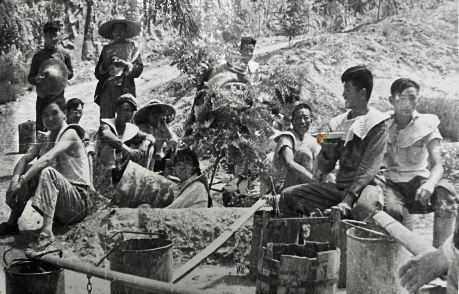 1958年黃委會職工在西峰南小河溝擔水期間休息。(資料圖)