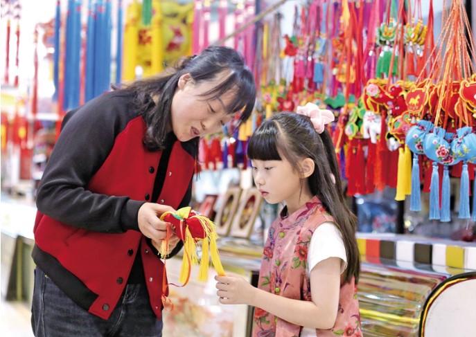 西峰城區(qū)一處攤位前,市民和孩子正在選購(gòu)香包。 慶陽融媒記者 盤小美 攝