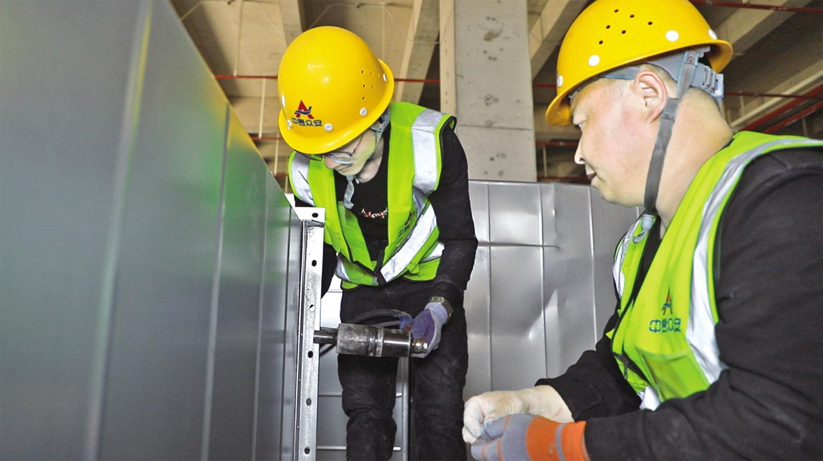 秦淮數(shù)據(jù)零碳數(shù)據(jù)中心項目施工現(xiàn)場,工人正在安裝室內(nèi)通風(fēng)管道。