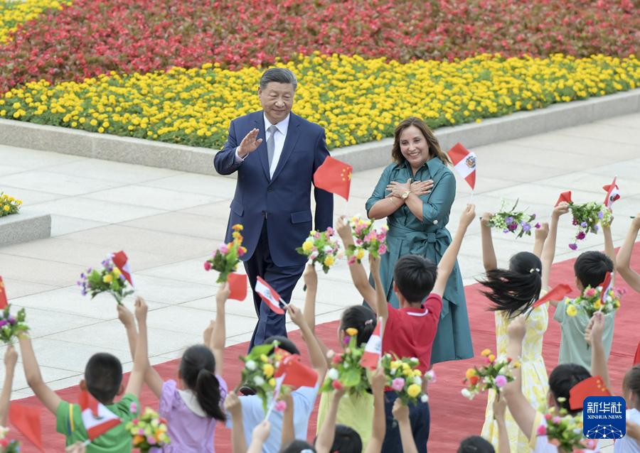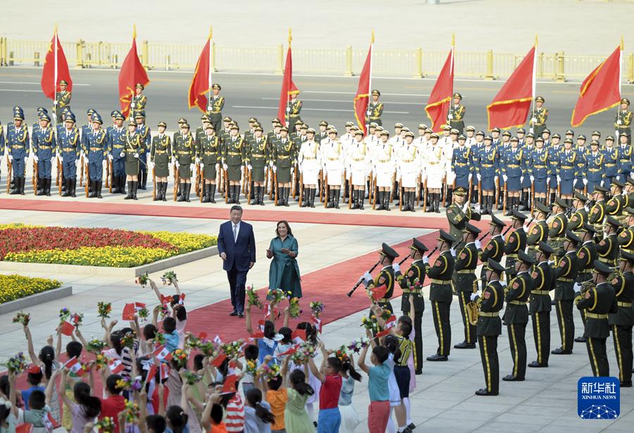 6月28日下午,國(guó)家主席習(xí)近平在北京人民大會(huì)堂同來華進(jìn)行國(guó)事訪問的秘魯總統(tǒng)博魯阿爾特舉行會(huì)談。這是會(huì)談前,習(xí)近平在人民大會(huì)堂東門外廣場(chǎng)為博魯阿爾特舉行歡迎儀式。新華社記者 高潔 攝