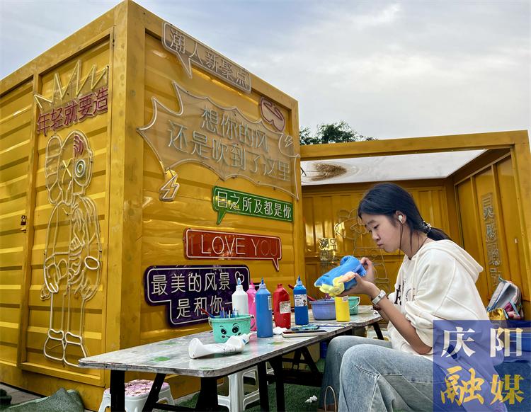 入夜時分,在西峰城區(qū)麗晶茂購物中心的廣場上,以“萬物皆可攤”為主題的集市燈光斑斕,纏一圈氛圍燈,支起折疊桌椅,再掛起標新立異的攤位招牌,一家家微型店鋪就張羅出來,冰粉鋪子、手工編織、冷鍋串串、漆扇……各類潮玩、美食層出不窮,設計感十足。
