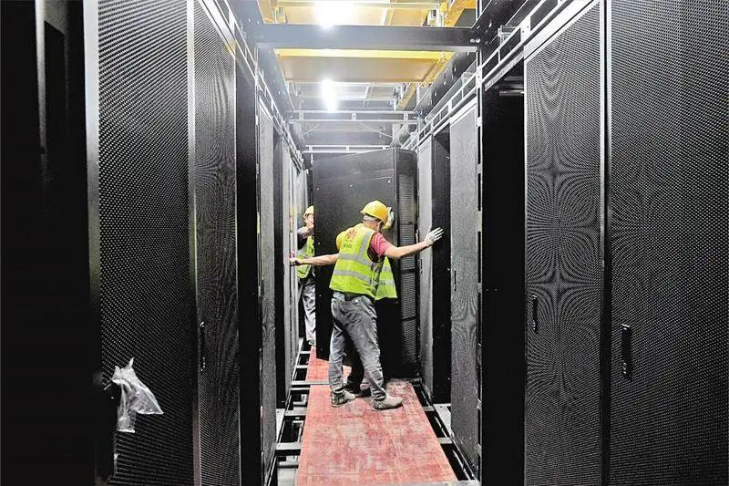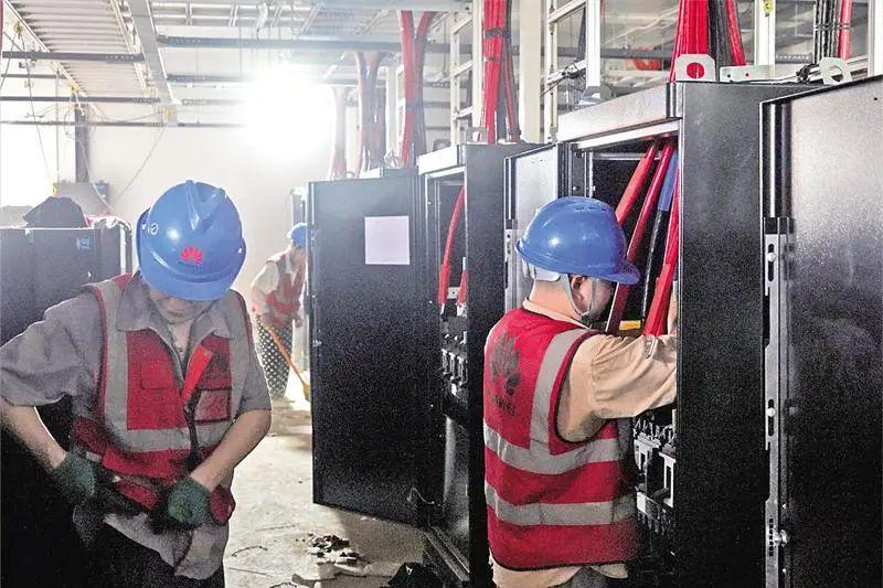 轟鳴,各種大型設(shè)備整齊擺放靜待安裝,機房內(nèi)工人們在進(jìn)行機柜及電池等相關(guān)設(shè)備安裝。