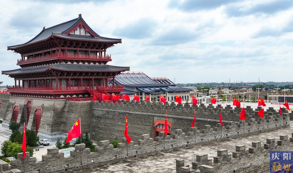 隴東風(fēng)情園城墻上插滿五星紅旗。
