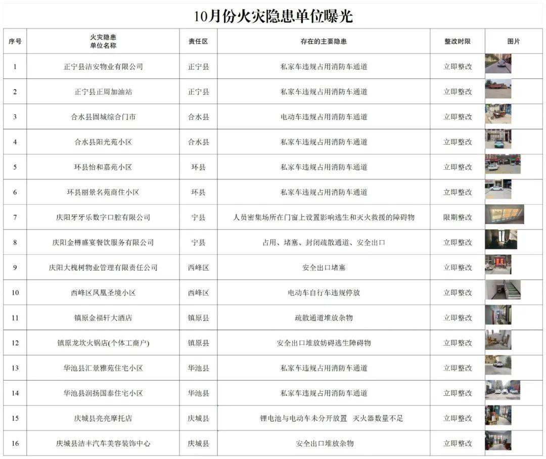 根據近期慶陽市消防救援支隊檢查情況,現將十月份全市火災隱患單位進行集中曝光,希望通過集中曝光,進一步樹牢社會單位和市民群眾消防安全理念,有效預防和遏制各類火災事故發(fā)生。