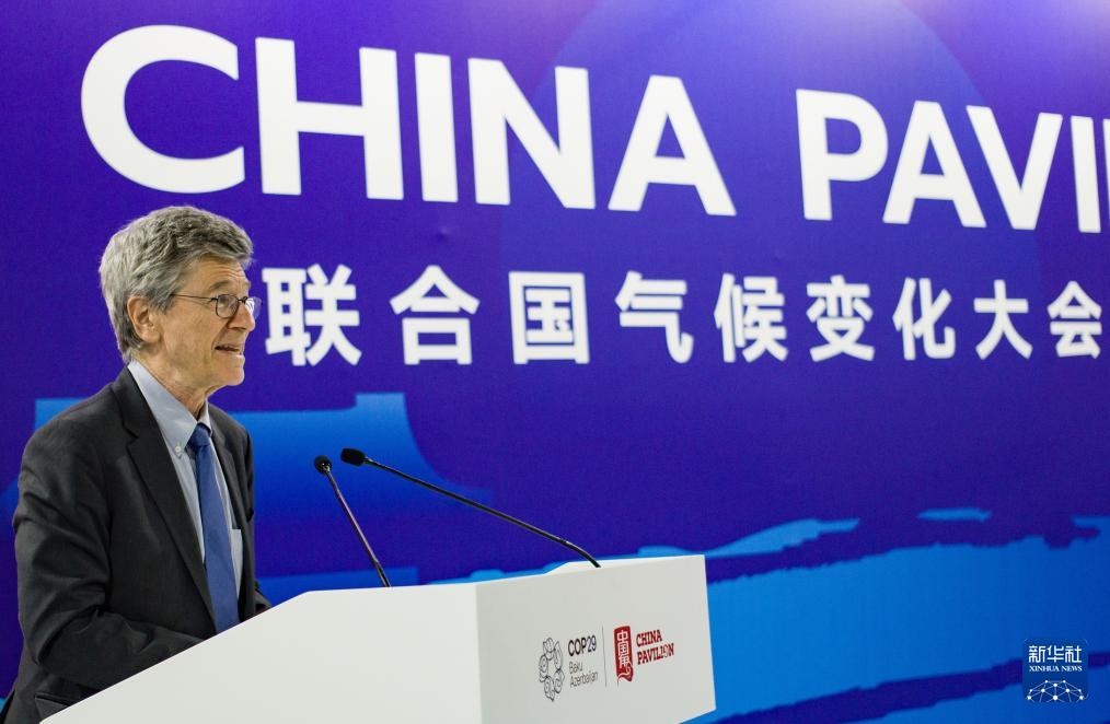 11月15日,在阿塞拜疆首都巴庫,聯(lián)合國可持續(xù)發(fā)展解決方案網(wǎng)絡(luò)負責人、美國哥倫比亞大學教授杰弗里·薩克斯參加COP29中國角邊會時講話。新華社記者 孟菁 攝