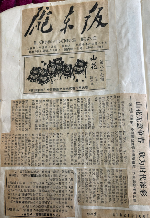 幾天后,一篇題為《黃色遐思》的散文終于誕生了,這篇短文通過一系列的聯(lián)想與描述,表達(dá)了自己對(duì)黃土地、華夏民族以及偉大祖國(guó)的無限感激與熱愛。1991年1月13日晚上,我將最終定稿的散文《黃色遐思》工工整整地寫在自己特意買來的稿紙上,小心翼翼地裝進(jìn)信封,第二天,騎自行車冒著刺骨的寒風(fēng)到五公里之外的縣城郵局去郵寄。稿件寄出之時(shí),我仿佛完成了一份光榮的任務(wù)。盡管之前自己已經(jīng)在其他報(bào)紙上發(fā)表過幾篇習(xí)作,但這次畢竟是第一次給心目中神圣的家鄉(xiāng)報(bào)紙《隴東報(bào)》投稿,心里既興奮又緊張。驚喜有時(shí)會(huì)在不經(jīng)意間突然降臨。近兩個(gè)月之后,我驚喜地發(fā)現(xiàn)自己的散文《黃色遐思》刊發(fā)在1991年3月13日的《隴東報(bào)》第四版“黃河象杯”全國(guó)微型文學(xué)大獎(jiǎng)賽專版上。不久,我便收到了編輯部寄來的墨香濃郁的樣報(bào)。