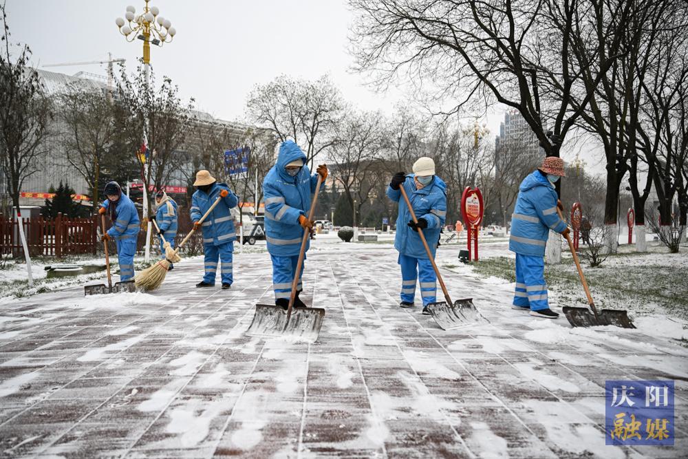西峰區(qū)和諧廣場(chǎng),環(huán)衛(wèi)工人鏟雪除冰。