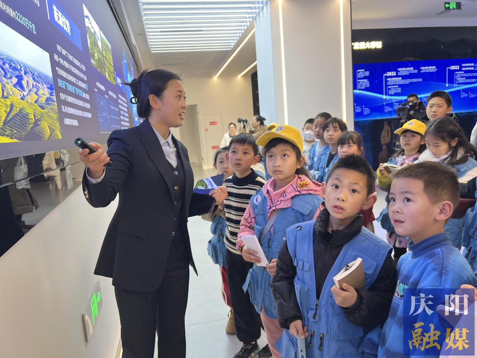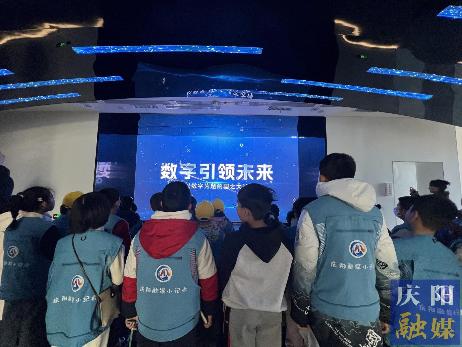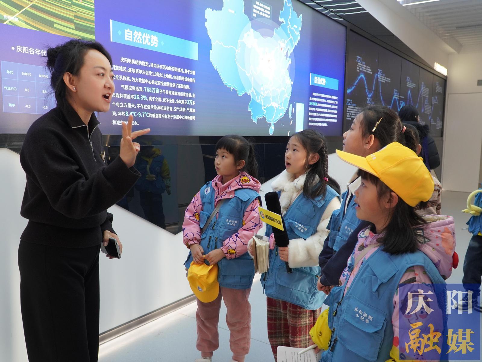 在慶陽(yáng)云創(chuàng)公司講解員李肖肖的帶領(lǐng)下,小記者們踏入了這個(gè)充滿科技感的展示空間。一進(jìn)門(mén),一幅巨大的數(shù)字畫(huà)卷映入眼簾,生動(dòng)展現(xiàn)了慶陽(yáng)市近年來(lái)在“東數(shù)西算”工程中的最新成果和亮點(diǎn)。小記者們紛紛駐足,用好奇的目光審視著這片數(shù)字世界的“新大陸”。