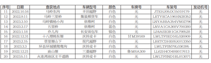 為了認(rèn)真貫徹落實全市油區(qū)治安管理工作會議精神,嚴(yán)厲打擊涉油“三無”車輛,依據(jù)國家相關(guān)法律法規(guī)規(guī)定,現(xiàn)將2021年1月至2023年1月期間,在環(huán)縣、慶城、華池油區(qū)查獲的48臺無牌、無證、無法確認(rèn)車主,且發(fā)動機號/車架號損毀(挫改)嚴(yán)重的“三無”車輛進(jìn)行公告,請車輛所有人自本公告發(fā)布之日起3個月內(nèi),前來慶陽市公安局長慶分局治安警察大隊接受處理,逾期不接受處理者,將按無主車輛予以拆解報廢。