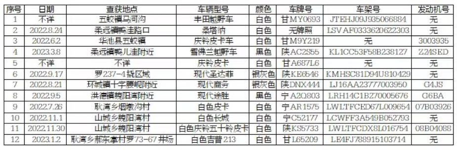 為了認(rèn)真貫徹落實(shí)全市油區(qū)治安管理工作會(huì)議精神,嚴(yán)厲打擊各類違法犯罪分子利用“三無”車輛實(shí)施違法犯罪活動(dòng),依據(jù)公安機(jī)關(guān)《辦理行政案件程序規(guī)定》,現(xiàn)將2021年1月至2023年3月來在環(huán)縣,華池、慶城、合水油區(qū)治安整治過程中査獲的24臺(tái)無牌、無證、無法確認(rèn)車主,且發(fā)動(dòng)機(jī)號(hào)/車架號(hào)損毀(挫改)嚴(yán)重的“三無”車輛進(jìn)行公告,在全國機(jī)動(dòng)車系統(tǒng)中無法查詢涉油嫌疑車輛信息(附明細(xì)),請(qǐng)車輛所有人自本公告發(fā)布之日起3個(gè)月內(nèi),前來慶陽市公安局長慶分局治安警察大隊(duì)接受處理,逾期不接受處理者,將按無主車輛予以拆解報(bào)廢。聯(lián)系電話:0934-8380764