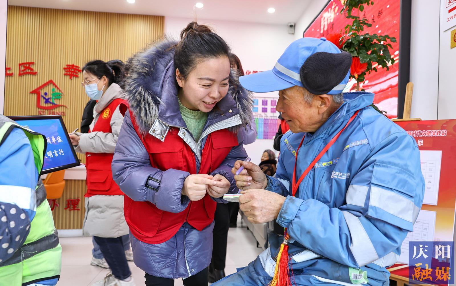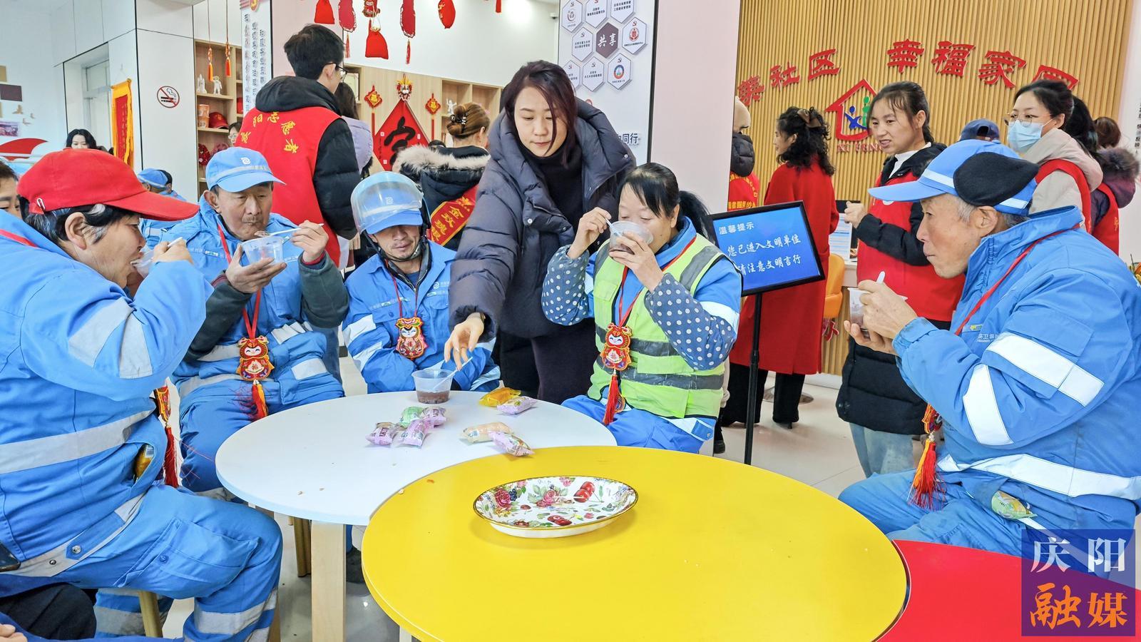 西峰區(qū)北大街社區(qū)工作人員給環(huán)衛(wèi)工人贈送香包。