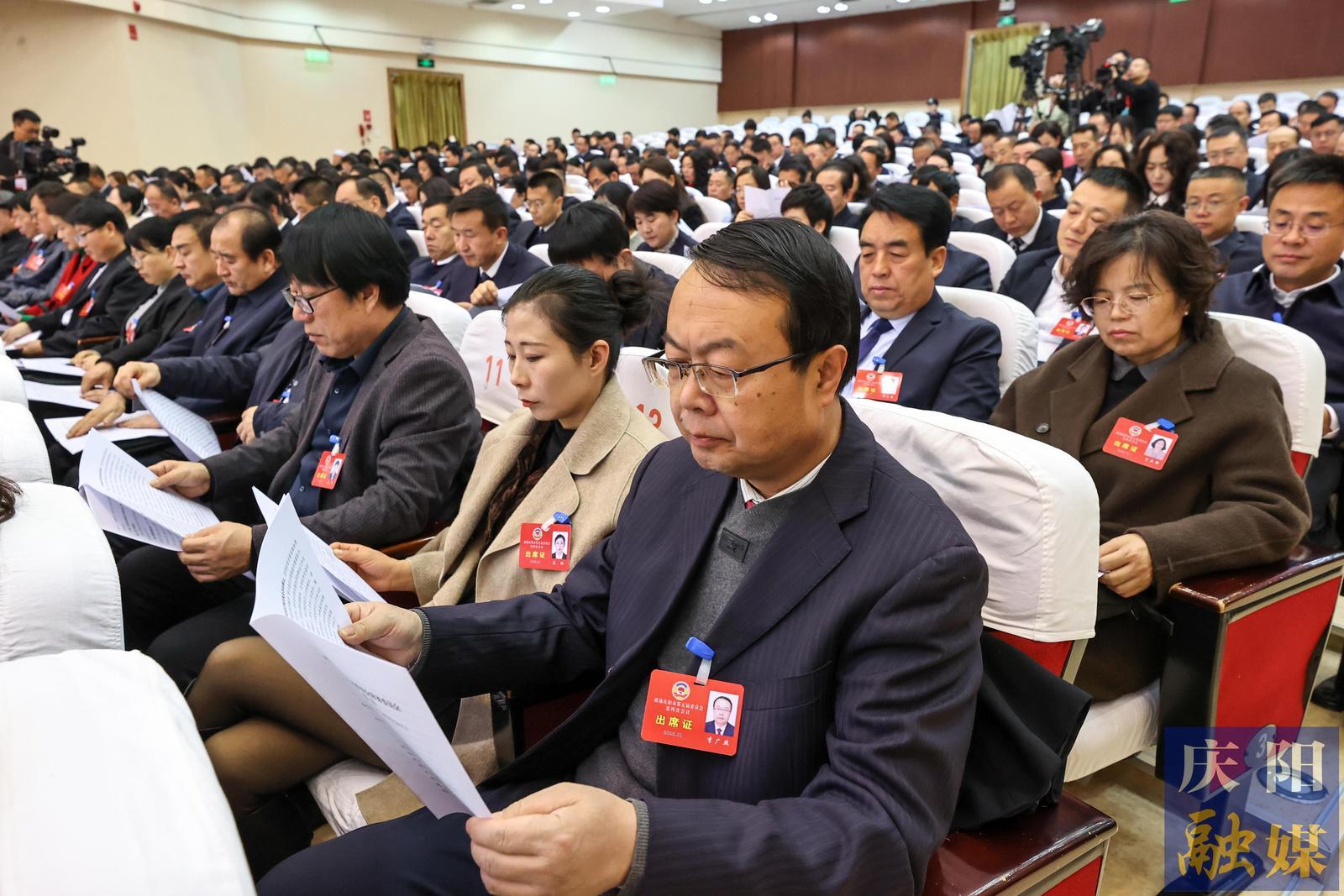 會場氣氛莊重?zé)崃?,主席臺正中懸掛著象征各族人民大團(tuán)結(jié)的政協(xié)會徽,在十面紅旗的映襯下熠熠生輝。會場內(nèi)高高懸掛著大紅條幅:踐行囑托,凝心聚力,奮力譜寫慶陽革命老區(qū)高質(zhì)量發(fā)展新篇章。