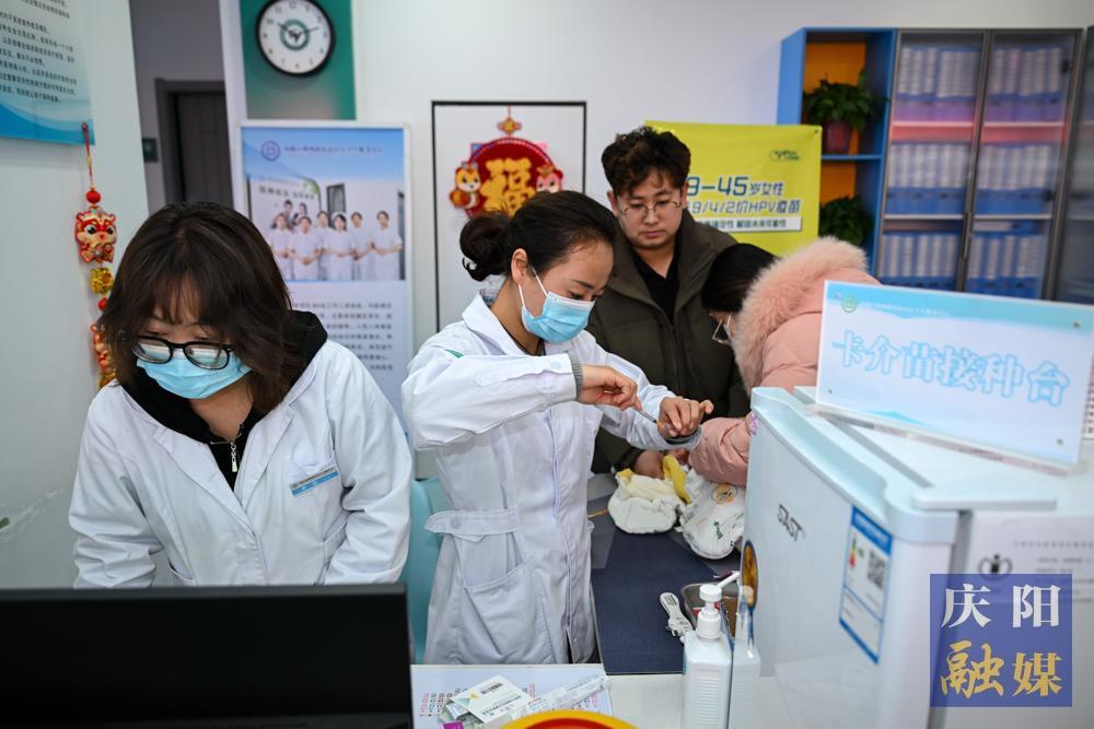 西峰區(qū)朔州路街道社區(qū)衛(wèi)生服務(wù)中心,醫(yī)務(wù)人員為小朋友們接種疫苗。