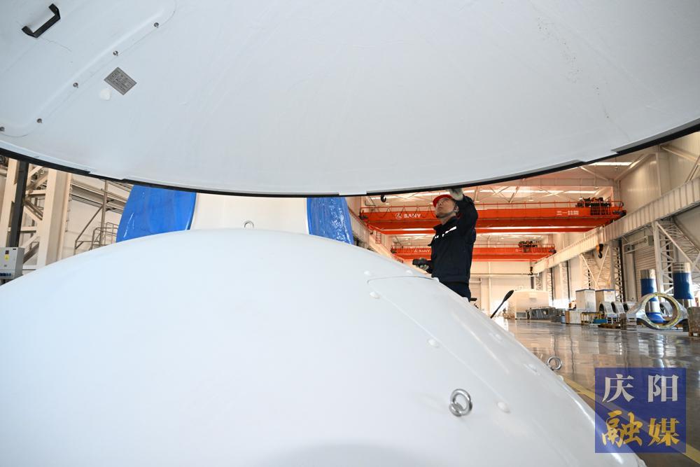 三一新能源裝備有限公司風(fēng)電智能制造項(xiàng)目生產(chǎn)車(chē)間,工人操作機(jī)械安裝風(fēng)電發(fā)電機(jī)導(dǎo)流罩。