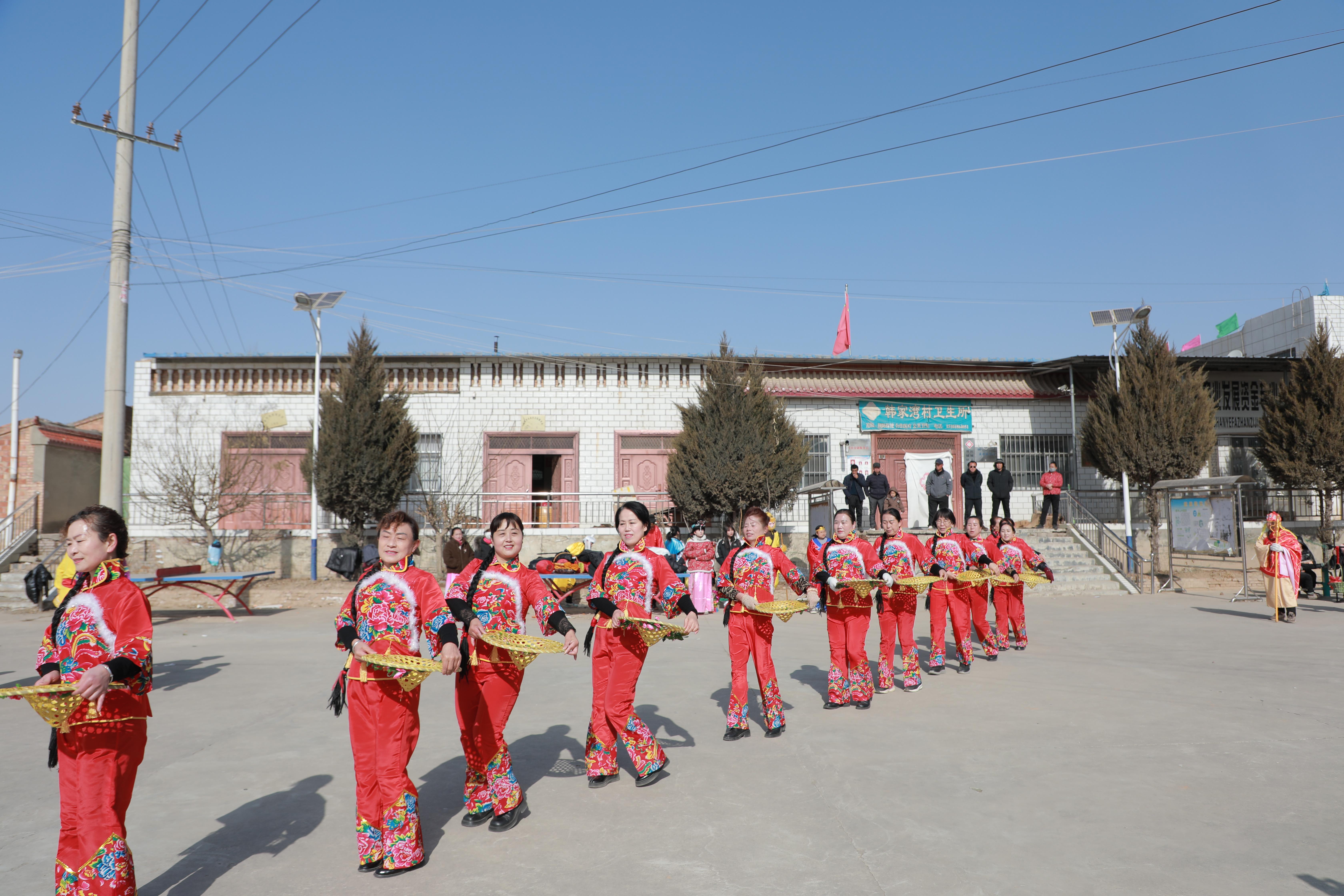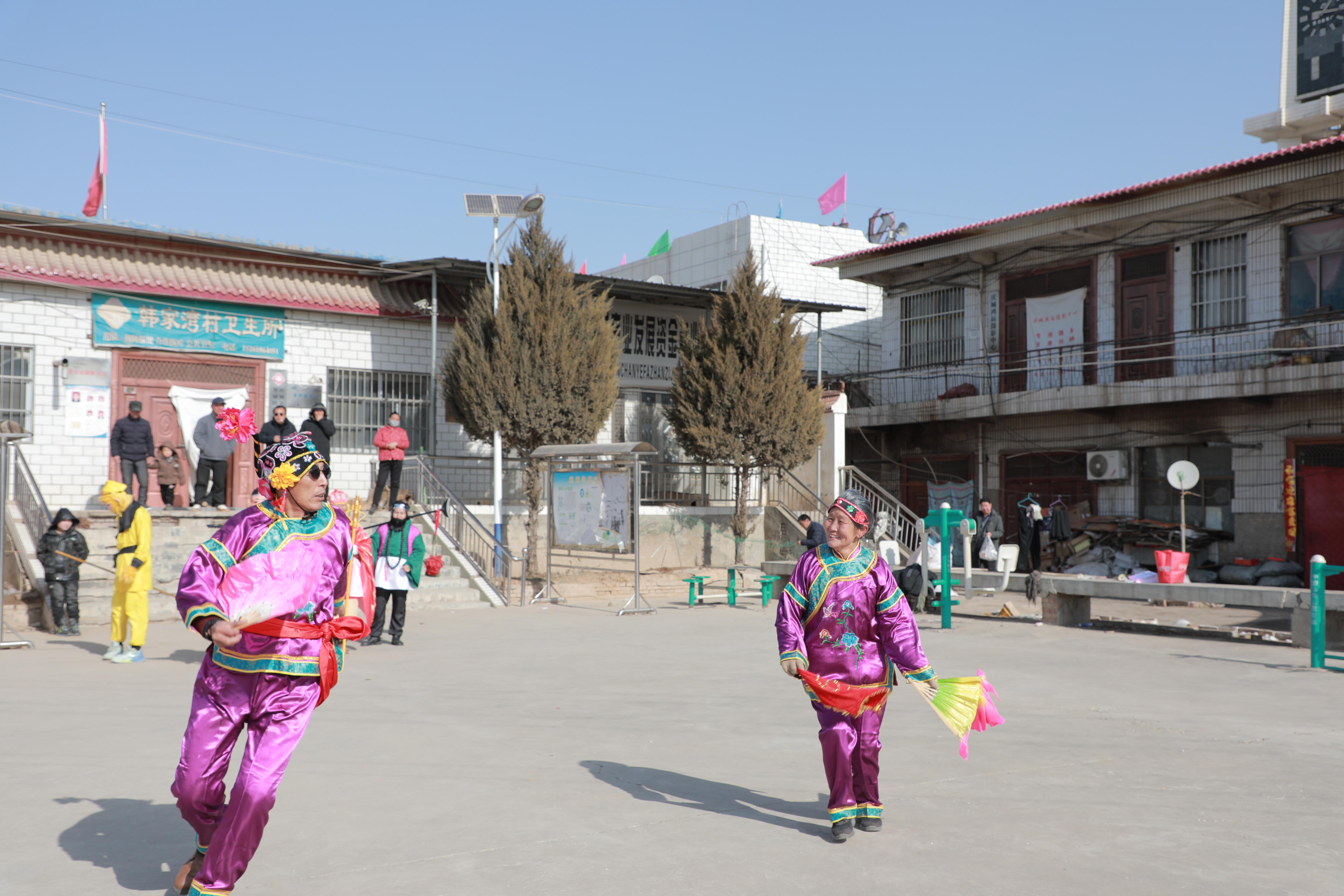 2月8日上午,室外溫度達(dá)到了零下十二攝氏度,但和寒冷天氣形成鮮明對比的是火熱的慶城縣社火排練現(xiàn)場。當(dāng)記者來到三十鋪鎮(zhèn)韓灣村時,社火《慶豐收》的演員們個個熱情高漲、精神抖擻,不畏嚴(yán)寒緊張地排練著。