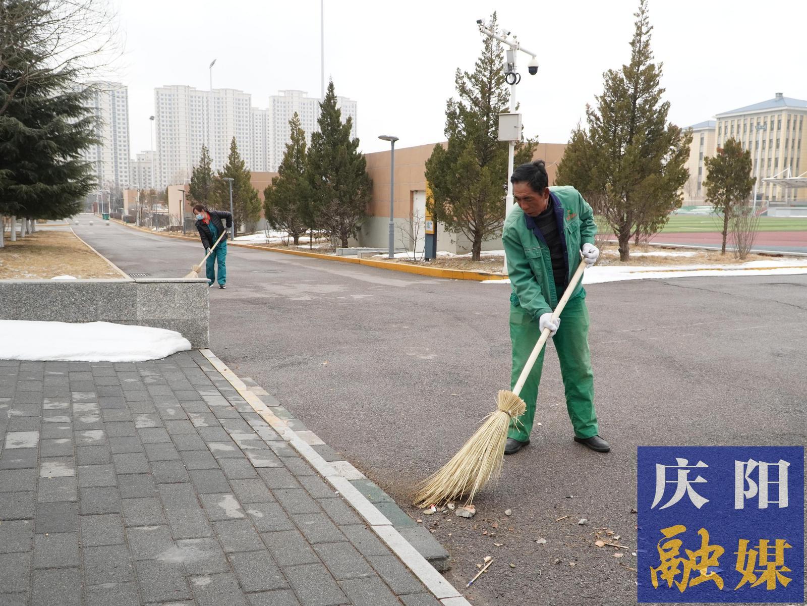 北師大慶陽(yáng)實(shí)驗(yàn)學(xué)校物業(yè)工作人員打掃校園衛(wèi)生