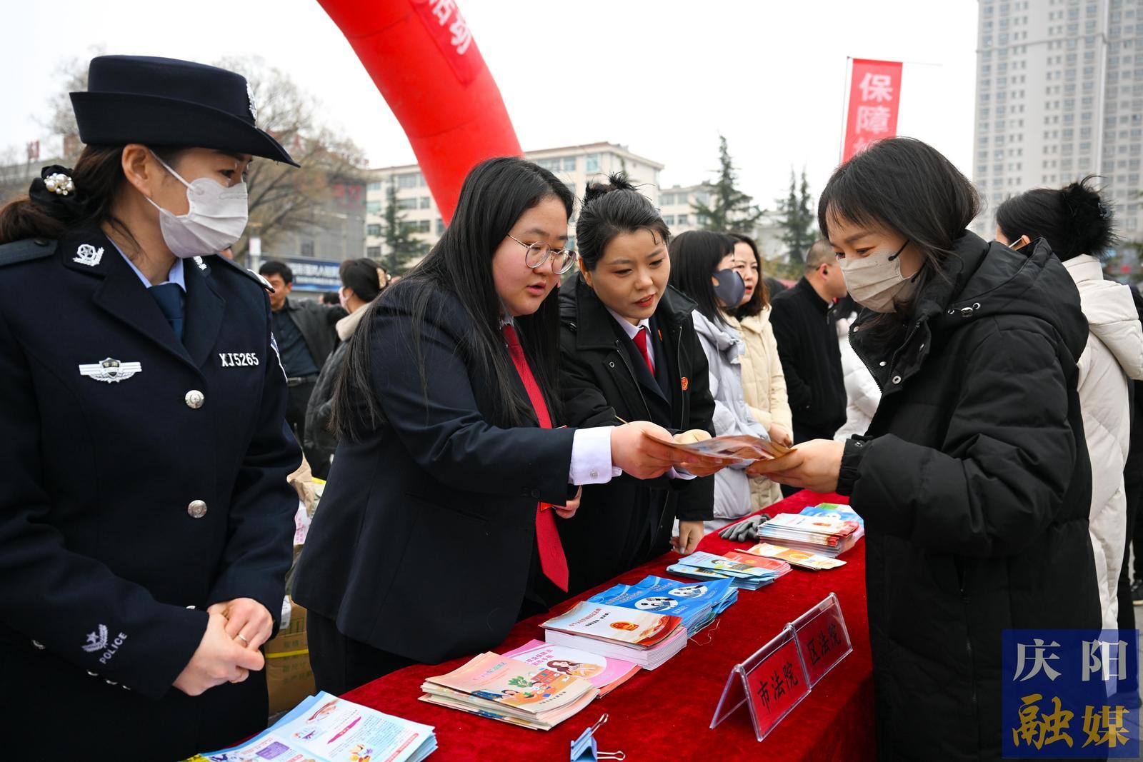慶陽市法院工作人員向市民宣傳《婦女權(quán)益保障法》等法律法規(guī)。