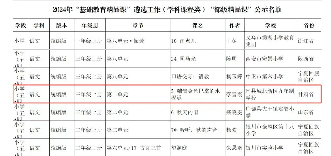 日前,國家教育部官網(wǎng)公布了2024年“基礎(chǔ)教育精品課”遴選名單,環(huán)縣城北新區(qū)九年制學(xué)校李雪霞老師選送的課例《鋪滿金色巴掌的水泥道》榮獲“部級精品課”。
