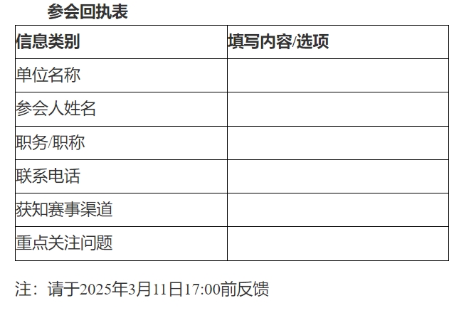 請意向參會選手于2025年3月11日(星期二)17:00前填寫《參會回執(zhí)表》(附后),將參會者單位信息、姓名、聯(lián)系方式、獲知賽事渠道,以及重點關(guān)注問題信息發(fā)送至郵箱wxzh@sic.gov.cn,組委會將收集整理您的問題,并在答疑會上作出回復(fù)。