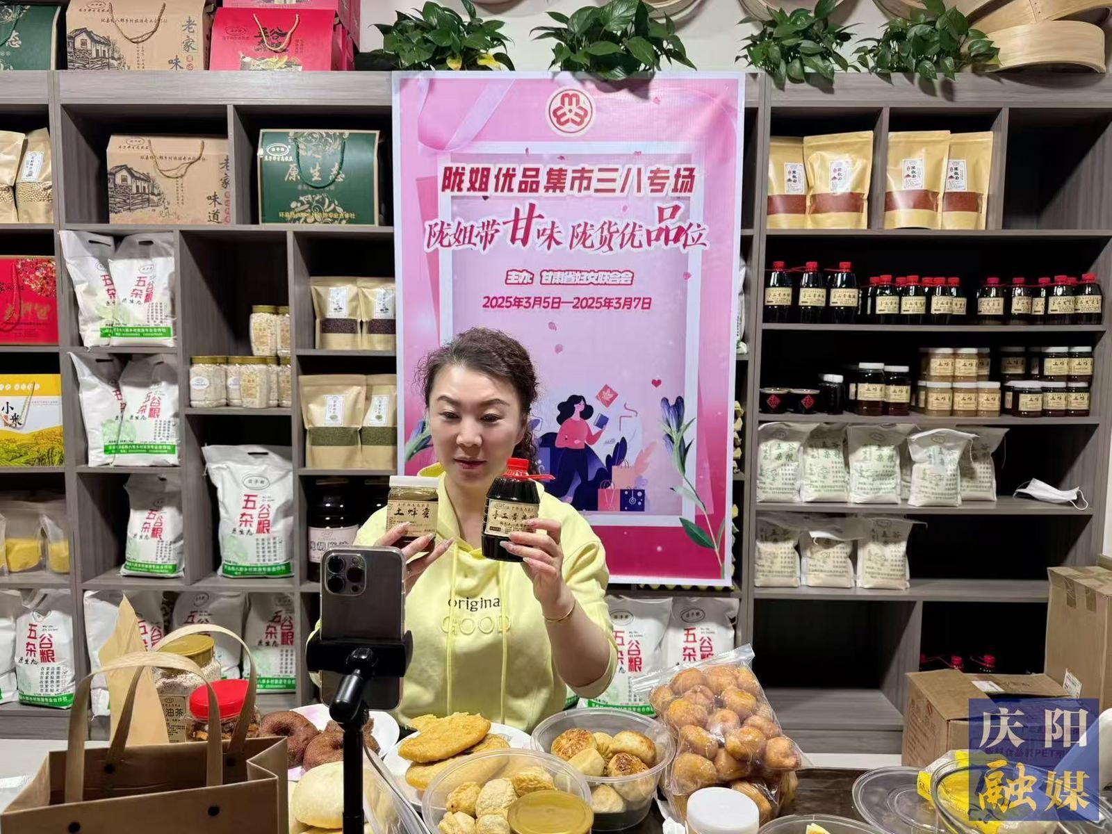 “隴姐優(yōu)品 慶陽好物”線上線下集市“三八”專場活動直播帶貨現(xiàn)場(3月5日攝)。