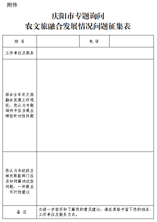 附件:《慶陽(yáng)市專題詢問農(nóng)文旅融合發(fā)展情況問題征集表》