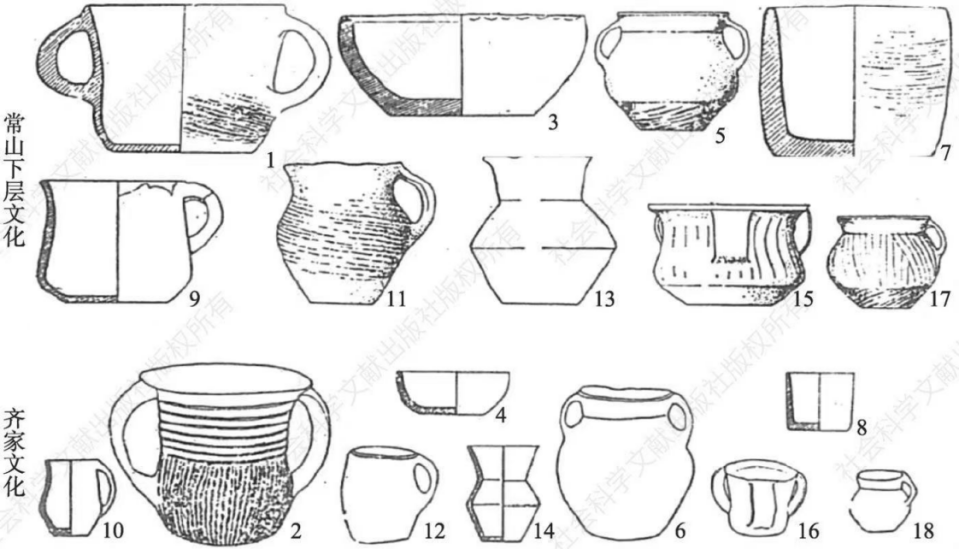 常山下層文化過去限于資料太少,對其研究進(jìn)展緩慢,近年來很多學(xué)者研究有了新的突破。陶器在常山下層文化中獨(dú)具特色,橙黃色、紅褐色陶器搭配斜行籃紋,成為其顯著特征。諸多齊家文化器物,如豎行籃紋單耳罐、單耳杯、雙耳杯、侈口罐等,皆可在常山下層文化中尋得淵源,胡謙盈據(jù)此提出“常山下層文化是齊家文化的重要來源”,張忠培亦認(rèn)為,常山下層文化的提出,有力推動了齊家文化淵源的研究。不過,學(xué)界對于齊家文化的起源尚存爭議,有人認(rèn)為齊家文化是馬廠類型的的延續(xù)與發(fā)展,也有人認(rèn)為是獨(dú)立發(fā)展而成,還有人認(rèn)為是馬家窯文化發(fā)展到馬廠類型后分東西兩支,一支發(fā)展為河西的四壩文化,一支發(fā)展為齊家文化。韓建業(yè)先生認(rèn)為齊家文化應(yīng)當(dāng)是客省莊二期文化西進(jìn)隴東南并與菜園文化融合的結(jié)果,齊家文化早期的絕對年代約在公元前 2400-前 2200 年,這個時段在中國內(nèi)地屬于銅石并用時代晚期,分布在天水一帶的遺存是齊家文化早期階段,常山下層文化絕對年代約在公元前2700-前2400年,相當(dāng)于廟底溝二期階段,再向下就屬于齊家文化早期階段。近年來,大多學(xué)者提出齊家文化源頭大致在隴東及寧夏南部,由東向西漸進(jìn)擴(kuò)展。