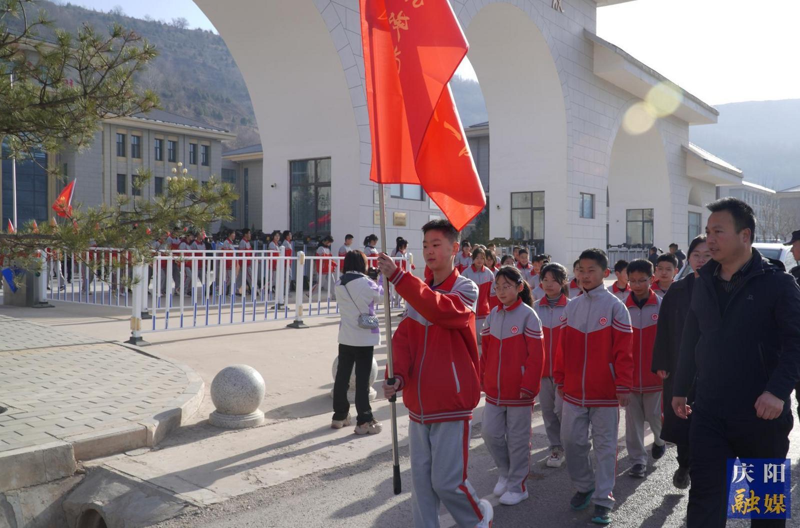 上午8:30分,華池縣列寧學(xué)校內(nèi)莊嚴(yán)肅穆,華池縣柔遠(yuǎn)初中、華池二中、城壕初中、山莊初中、列寧學(xué)校師生及各界代表懷著崇敬的心情列隊集合,舉行出征儀式。5所學(xué)校16支先鋒隊被授予“紅色傳承先鋒隊”旗幟,隨后師生代表吹響沖鋒號揮旗出發(fā),開啟這場特別的旅程。
