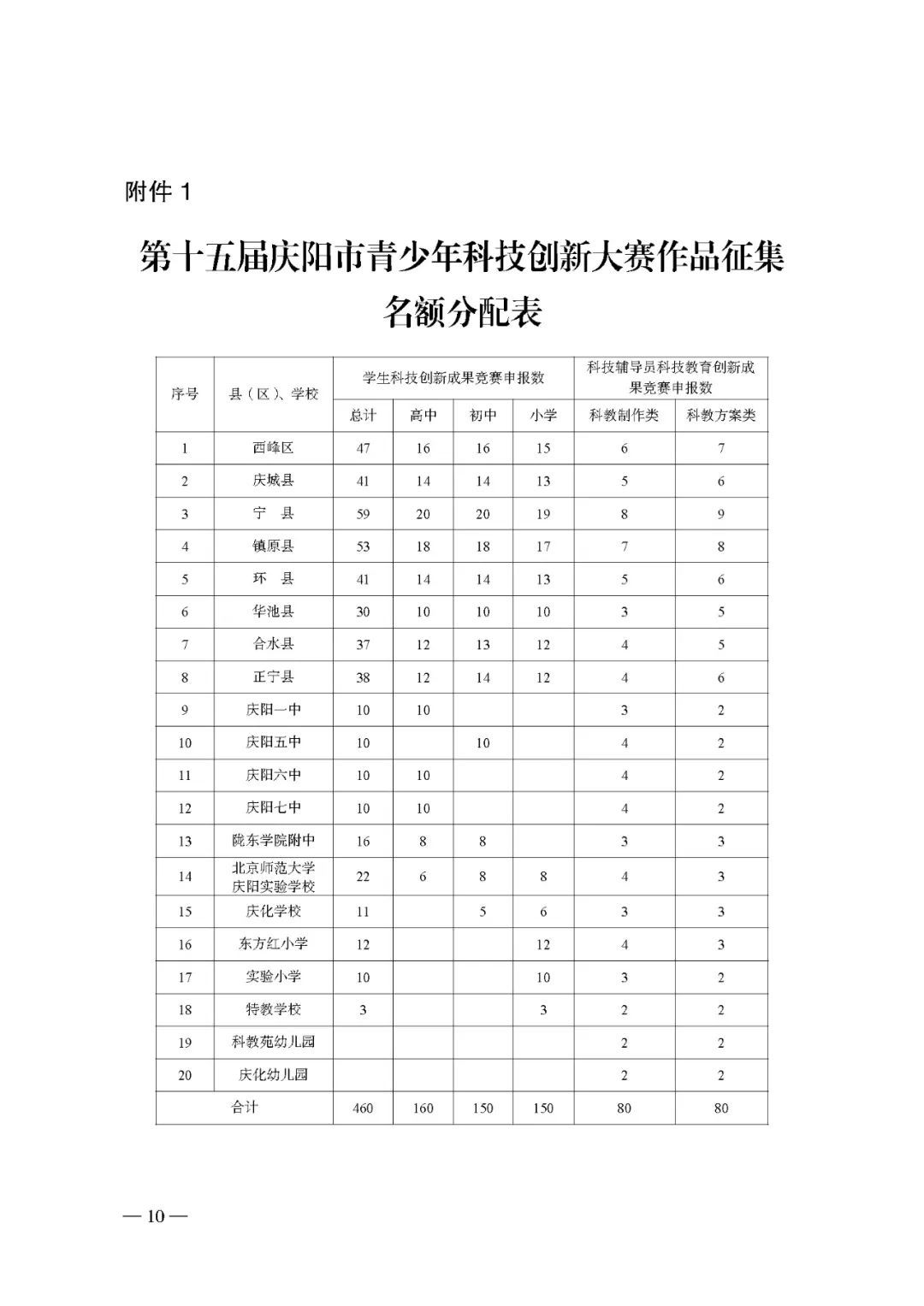 1.第十五屆慶陽(yáng)市青少年科技創(chuàng)新大賽作品征集名額分配表