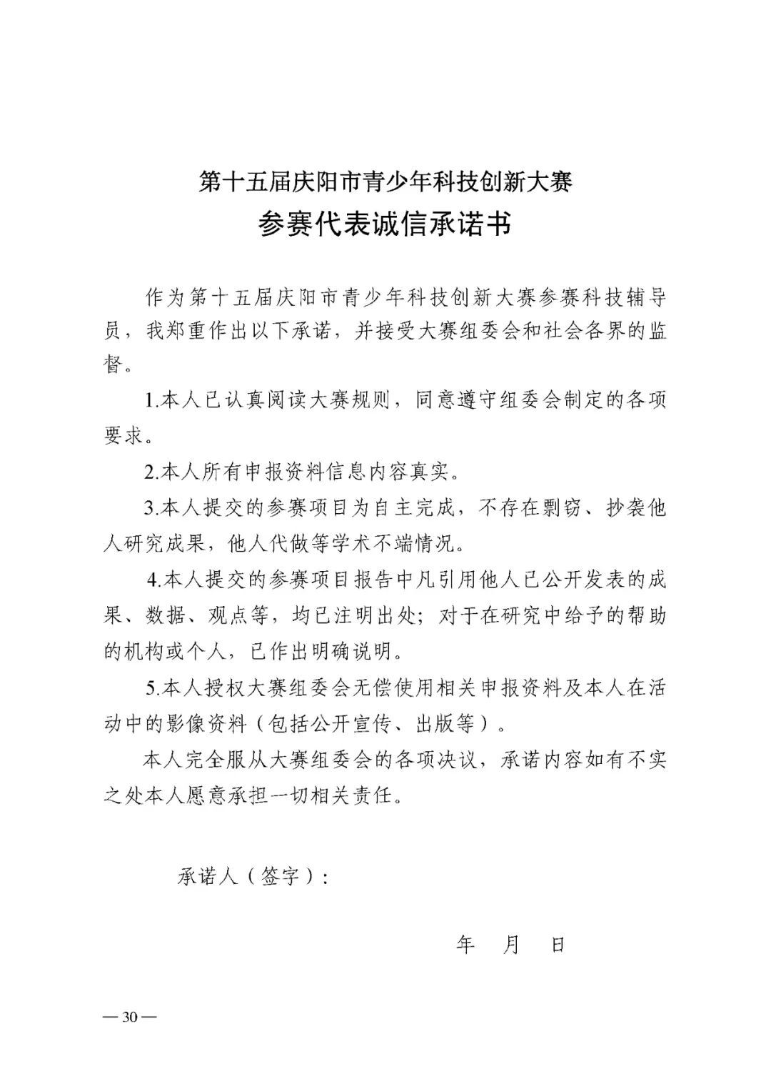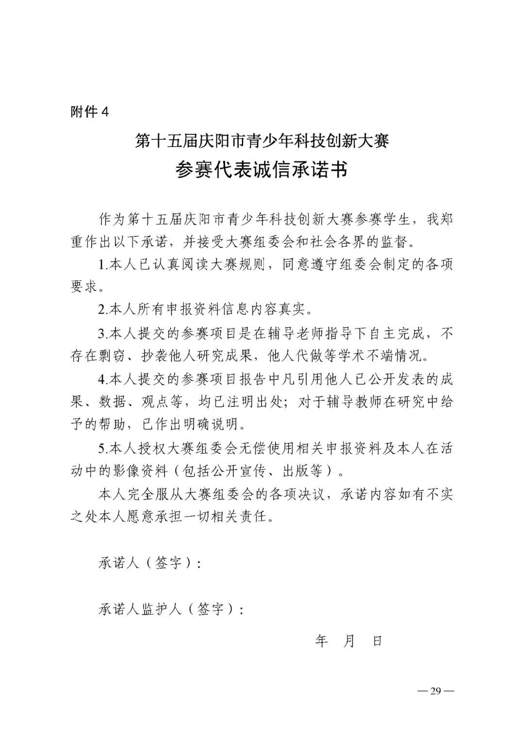 4.第十五屆慶陽(yáng)市青少年科技創(chuàng)新大賽參賽代表誠(chéng)信承諾書
