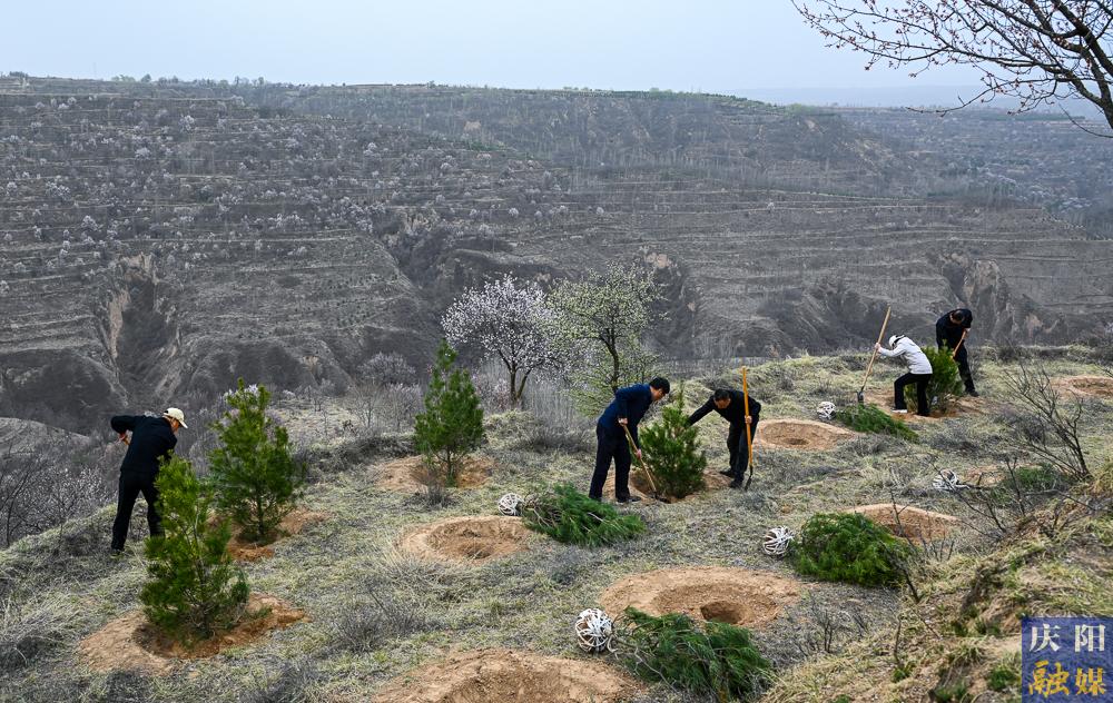 干部職工在西峰區(qū)后官寨鎮(zhèn)路堡村開展義務植樹活動。