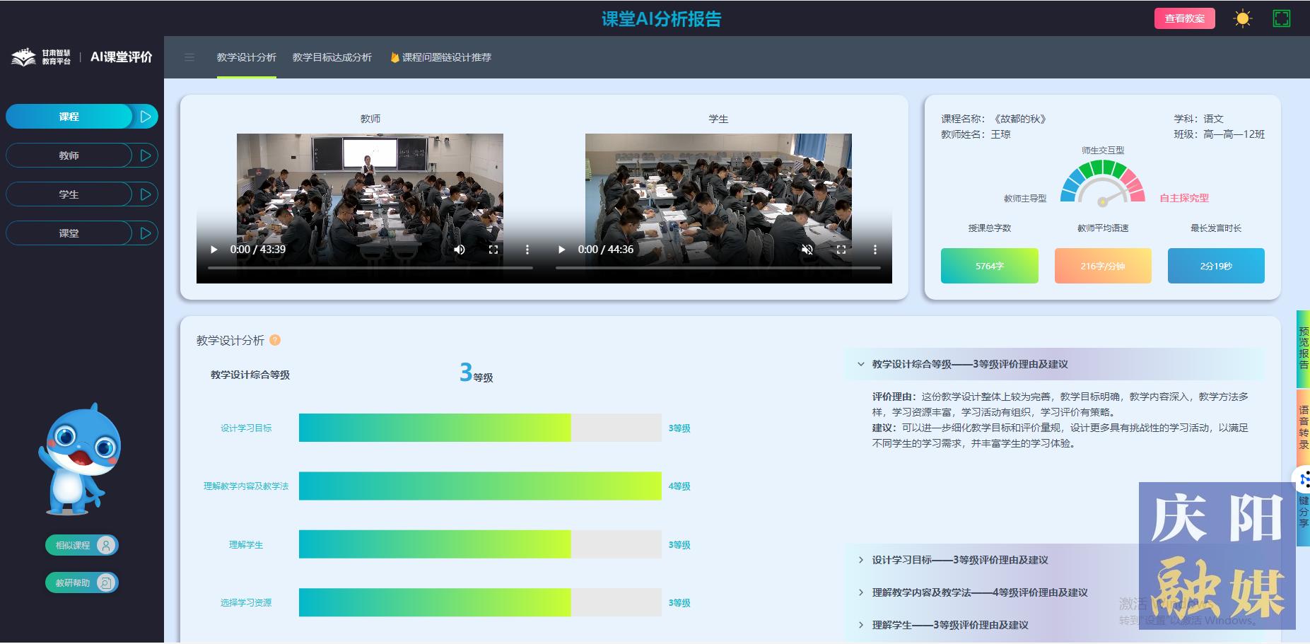 在北師大慶陽實(shí)驗(yàn)學(xué)校的“AI智慧教室”,攝像頭無聲記錄著課堂細(xì)節(jié)。教師劉俊妮剛結(jié)束函數(shù)課,系統(tǒng)便自動(dòng)生成了一份課堂分析報(bào)告:“學(xué)生討論時(shí)間占28%,例題正確率91%,需強(qiáng)化三個(gè)典型錯(cuò)誤?!眻?bào)告不僅清晰呈現(xiàn)各項(xiàng)數(shù)據(jù),更以波形圖展示課堂節(jié)奏,助力教師精準(zhǔn)“把脈開方”。