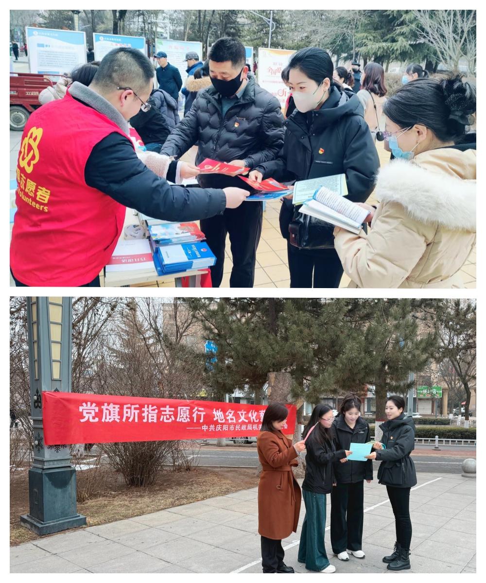 為進(jìn)一步加強(qiáng)我市地名文化建設(shè),弘揚(yáng)地名文化,積極營(yíng)造全社會(huì)關(guān)心支持地名管理和地名文化保護(hù)的良好氛圍,慶陽(yáng)市民政局加強(qiáng)黨建和業(yè)務(wù)的深度融合,探索“地名+志愿服務(wù)”模式,積極構(gòu)建以黨建為引領(lǐng)、社區(qū)和校園為平臺(tái)、志愿服務(wù)為載體的聯(lián)動(dòng)機(jī)制,舉辦地名文化進(jìn)校園、進(jìn)社區(qū)活動(dòng),通過(guò)懸掛條幅、發(fā)放宣傳單、現(xiàn)場(chǎng)講解、講趣味故事等方式,讓每一個(gè)地名都“活”起來(lái),使慶陽(yáng)地名文化以更生動(dòng)、更直觀、更富活力的方式呈現(xiàn)在群眾面前、融入群眾生活。